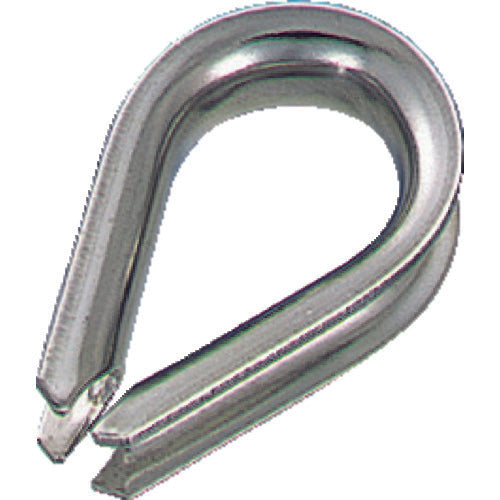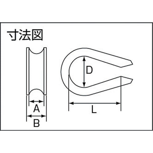 カタログ品番:TRS-6 特長:●端末加工するワイヤコースとして使います。 用途:●ワイヤロープの先端をアイ加工して使用する場合のワイヤの摩耗の防止。 仕様:●適合ロープ径(mm):6●A(mm):7●B(mm):9●D(mm):15●L(mm):25 材質/仕上:●ステンレス(SUS304)