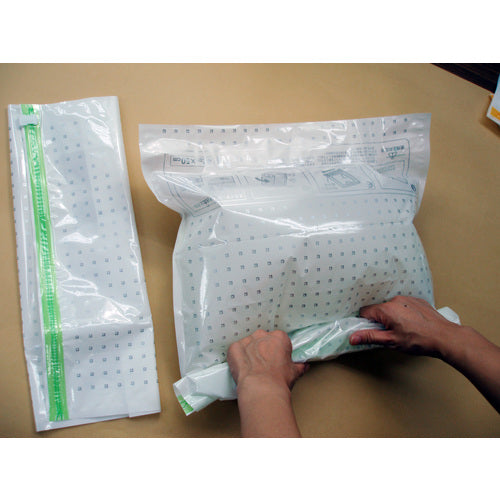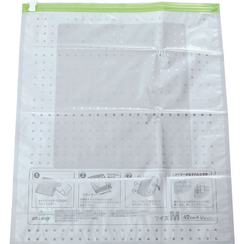 カタログ品番:TASB-3042 特長:●圧縮梱包により省スペースでの保管が可能です。●スライドジッパーで簡単に圧縮でき、ウレタンや綿など場所を取る商品の梱包に便利です。 用途:●衣類などの保管に。 仕様:●色:透明●縦(mm):420●横(mm):300●厚さ(mm):0.065●袋入数:2枚●折り畳み寸法(横):160mm×縦340mm×高さ10mm 材質/仕上:●ポリエチレン●ナイロン 注意:●チャックから5cm以上離れた位置までに収納して下さい。