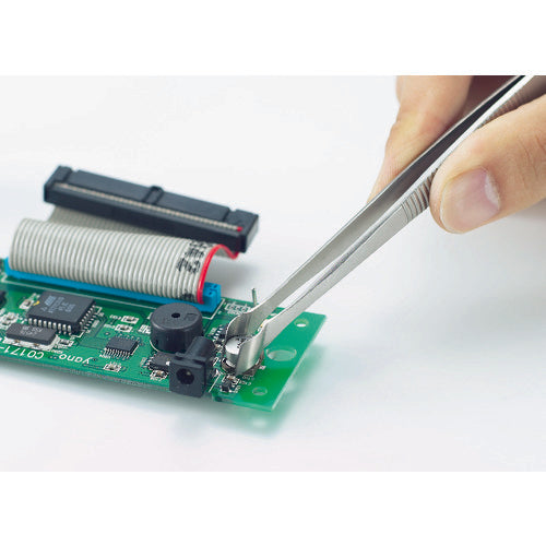 カタログ品番:572-SA 特長:●SUS420Jに比べさびにくく、耐久性に優れています。●コンデンサーやコイルなどの取り外し、装着に最適な組み立て用ピンセットです。 用途:●φ3.7〜10mmまでの部品用。 仕様:●全長(mm):150●幅(mm):9.5●先端幅(mm):6.4(横型)●先端:横型 材質/仕上:●耐酸耐磁ステンレス(SUS304L)
