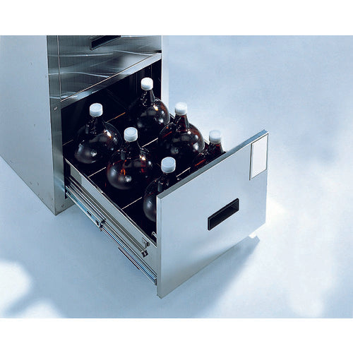 カタログ品番:SY-2 特長:●取手は薬品に強いABS樹脂製です。●オールロック機構、ラッチ機構、転倒防止機構付です。●ガロンビン12本収納できます。●高さが330mmまでのビン・ポリタンクが収納できます。 仕様:●間口(mm):455●奥行(mm):600●高さ(mm):800●最大積載量(kg/台):50●設置タイプ:上置・下置兼用●引出し数:2●均等積載量(kg/段):30●収納目安:ガロンビン(12本)●完成品●鍵付き 材質/仕上:●ステンレス(SUS304) セット内容/付属品:●鍵×2、上下連結金具×4、床面・壁面用固定金具×5、トラスねじ×18、釘×5●仕切板2段分 注意:●収納物は含まれてません。