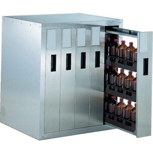 カタログ品番:TK-5 特長:●1列の引き出しに500ml薬びん15本収納できます。●地震などの不慮の事故での二次災害を防ぎます。●取手は薬品に強いABS樹脂製です。●オールロック機構、転倒防止機構、ラッチ機構付です。●1列の引出しに500ml薬ビン15本収納できます。 仕様:●間口(mm):705●奥行(mm):600●高さ(mm):800●最大積載量(kg/台):80●設置タイプ:上置・下置兼用●引出し数:5●均等積載量(kg/段):20●引出し内寸:間口109×奥行472×高さ700mm●鍵付き 材質/仕上:●ステンレス(SUS304) セット内容/付属品:●トレー×15、仕切板×60、鍵×2、上下連結金具×4、床面・壁面用固定金具×5、トラスねじ×18、釘×5 注意:●収納物は含まれてません。●収納物は含まれません。