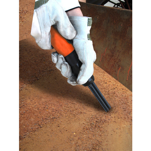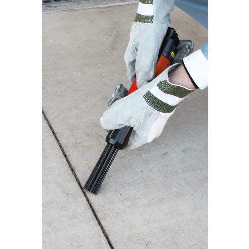 カタログ品番:TS-16A 特長:●軽量ですが、12本ニードル使用で、ハードなハツリ作業にも対応できます。●3ΦX125mmのニードル対応です。●ゴム製の振動吸収グリップを採用しています。●現場の声から生まれた握りの大きいつかみやすいグリップを採用しています。●異物混入を防ぐ、エアフィルター標準装備です。●耐久性の高いワイヤーブレードホースです。 用途:●溶接後のスラグ・スパッタ落としに。●凸凹面のある金属面の錆び取り・塗装落としに。 仕様:●適合針寸法(mm):3×125●無負荷打撃数(min[[の−1乗]]):5500●空気消費量([[M3]]/min):0.08●ホース取付口:Rc1/4●全長(mm):290●奥行(mm):40●高さ(mm):70●使用空気圧力(MPa):0.6●ホース取入口:Rc1/4●3分オスプラグ●ニードル数12本使用●針長(mm):125●針タガネ径(mm):3×125●使用空気圧力:0.6MPa セット内容/付属品:●ワイヤーブレードエアーホースASSY●3Φ×125ニードル 24本