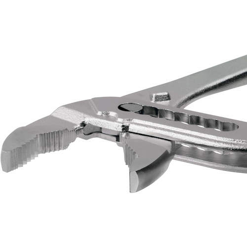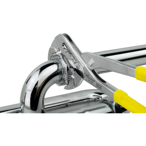 カタログ品番:WP-250BJ 特長:●2つの本体を差し込んで組み、ジョイントすることで高剛性、高耐久性構造となっています。●スリムな先端とフラット形状。ボルトが出っ張らず狭い箇所に入り込む。●3点保持で丸いパイプもガッチリ掴む。●指を挟まない安全ストッパー付き。ハンドルを閉じた状態で隙間ができる構造。●非対称つかみ刃で強い締め付け。回転方向に掴み刃が立っているのでパイプに喰い込み、滑りません。●ニッケルクロムメッキ仕上げにより、サビに強く水廻りの作業にお使いいただけます。 用途:●水道・ガス等の配管工事。自動車、産業機械のメンテナンスに。 仕様:●最大口開き(mm):52●全長(mm):252●調整(段階):7●使用範囲:パイプ外径6〜52mm●7段階口開き調整●掴み部高周波焼き入れ:52〜58HRC 材質/仕上:●機械構造用炭素鋼●グリップ:塩化ビニール●表面処理:ニッケルクロムメッキ 注意:●非絶縁工具です。電源を切ってお使い下さい。●使用用途以外には使用しないで下さい。●その他商品台紙注意事項参照。