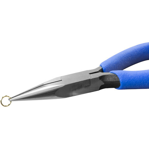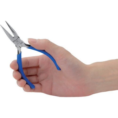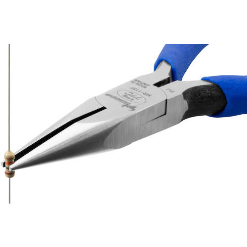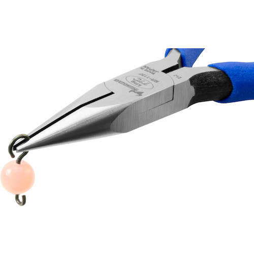 カタログ品番:MR-115F 特長:●先端で繊細な加工がしやすい刃がないタイプ。●掴んだ際にワークを傷つけにくい溝なし仕様。●バネによる連続作業の負担を軽減。 用途:●アクセサリーや精密機器など、小さな部品の曲げ加工、保持や取り付けに。 仕様:●全長(mm):124●切断能力なし●ばね付●先端部溝・ギザなし 材質/仕上:●機械構造用炭素鋼●グリップ:塩化ビニール 注意:●非絶縁工具です。電源を切ってお使い下さい。●使用用途以外には使用しないで下さい。●その他商品台紙注意事項参照。