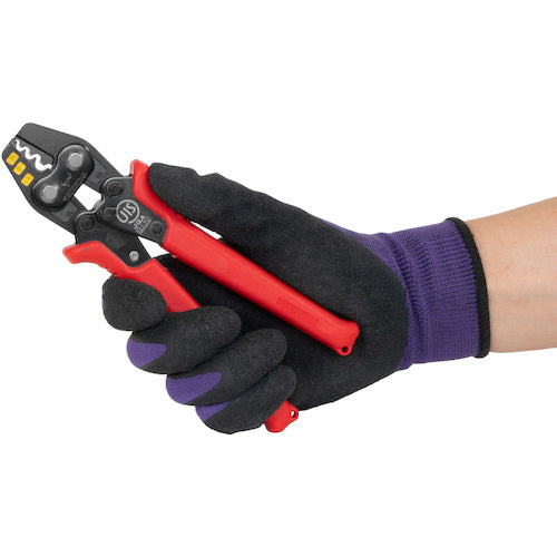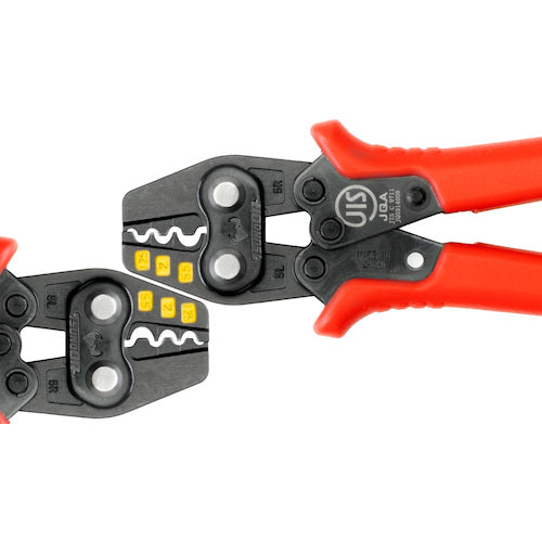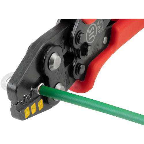 カタログ品番:TP-5 特長:●成形確認機構内蔵で圧着マークがくっきりするため、ミス防止になります。●仮押さえ可能で作業がスムーズに進みます。●JIS C9711適合品です。●軽量・コンパクトタイプ、片手で5.5sq電線の圧着ができます。●トグル機構採用で単位ストロークあたりの所要握力を軽減します。●圧着が完了しないとハンドルが開かない構造になっています。●両面カラーマーカーで作業効率がアップします。●手に優しいエラストマーグリップにより連続作業も疲れません。●グリップにはストラップ取り付け穴が付いています。●必要な圧着力が楽に得られます。 用途:●裸端子やスリーブを用いた電線の圧着・接続作業に。 仕様:●全長(mm):176●圧着端子([[MM2]])裸端子用:1.25、2、5.5●ハンドル幅(mm):65●頭部幅(mm):37 材質/仕上:●本体:機械構造用炭素鋼●グリップ:エラストマー樹脂●頭部:クロムモリブデン鋼 注意:●非絶縁工具です。電源を切ってお使い下さい。●使用用途以外には使用しないで下さい。●その他商品台紙注意事項参照。