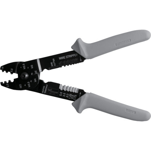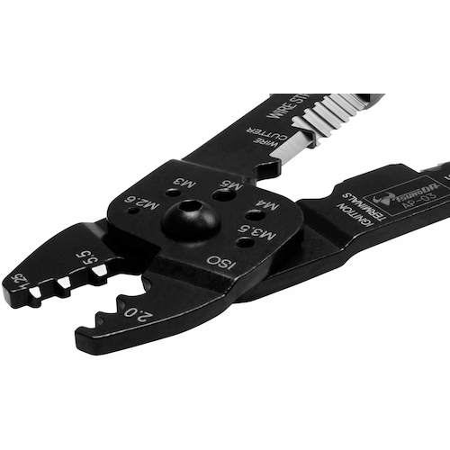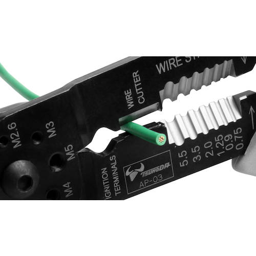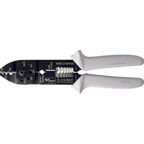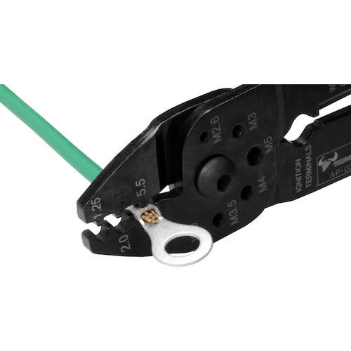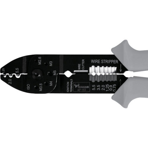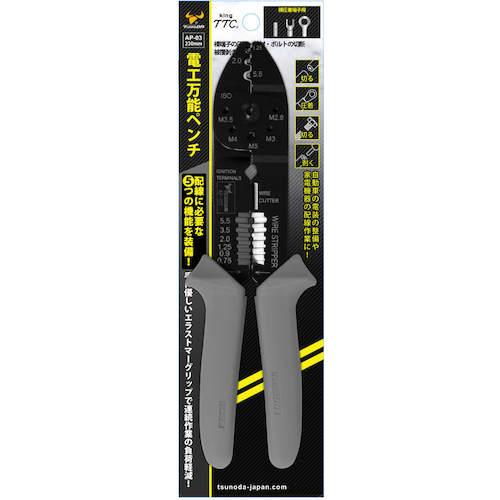 カタログ品番:AP-03 特長:●これ1本で電気配線に必要な5つの機能(裸圧着端子圧着、ボルト・ネジの切断、イグニッションターミナル圧着、ワイヤーカッター、ワイヤーストリッパー)を装備しています。●手に優しいエラストマーグリップを採用しています。 用途:●自動車や電子機器などの配線の各種圧着端子の圧着、小ネジの切断に。 仕様:●全長(mm):223●圧着端子([[MM2]]):1.25/2.0/5.5●圧着端子([[MM2]])裸端子用:1.25、2.0、5.5●ハンドル幅(mm):53●頭部幅(mm):39●切断能力:軟鉄線φ1.2mm/銅線φ2mm/より線5.5[[MM2]] 材質/仕上:●炭素鋼●グリップ:エラストマー樹脂 注意:●非絶縁工具です。電源を切ってお使い下さい。●使用用途以外には使用しないで下さい。●その他商品台紙注意事項参照。