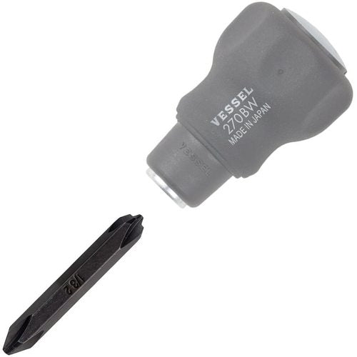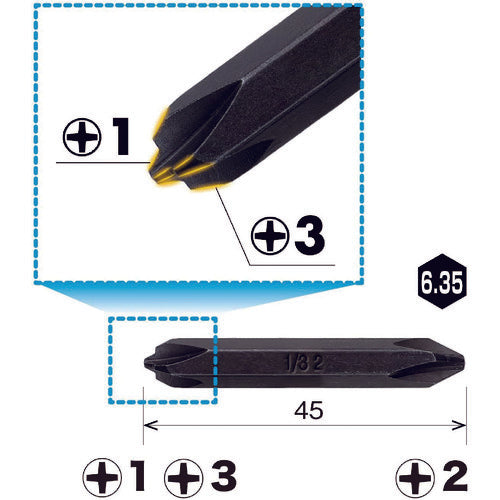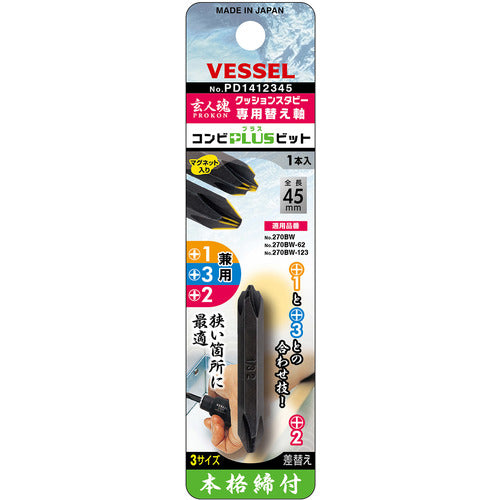 カタログ品番:PD1412345 特長:●差替えドライバーの専用差替え軸です。●よく使われている(+)1、(+)2、(+)3のネジに一本で対応できます。●最も使用頻度の高い(+)2は専用刃先で使い易いです。●強力マグネット入りビットです。 用途:●電気工事・家具の組立・メンテナンス・車載などに。 仕様:●刃先:[[+]]1・3/[[+]]2●軸長(mm):45●替え軸適用品番:270BW / 270BW-62 / 270BW-123●ビット差込口(mm):対辺6.35●全身焼入●マグネット入り 材質/仕上:●工業用特殊合金鋼 注意:●兼用刃先側は特殊形状のため、電動ドライバーでは使用しないでください。