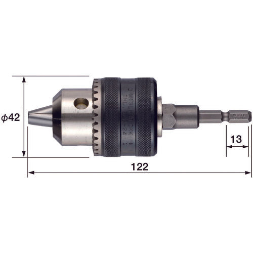 カタログ品番:BH-23 特長:●電動ドライバーに取り付けて、穴あけ・切削・研磨作業ができます。●チャックの爪は精度が高く抜群の把握力です。●チャックキー付です。●六角シャンク径は6.35mmです。●先端工具を取り付けて、ドリルで穴あけ、軸付砥石で研磨、ビットでネジ締めなど、いろいろな作業が可能になります。●抜群の把握力・高精度です。●耐久性に優れたシャフト部です。●付属のキイで先端工具を着脱します。 仕様:●チャック能力(mm):1.5〜13.0●最大チャック能力(mm):13●全長(mm):122●種類:キー付き●コレット能力(mm):1.5〜13 セット内容/付属品:●チャックキー