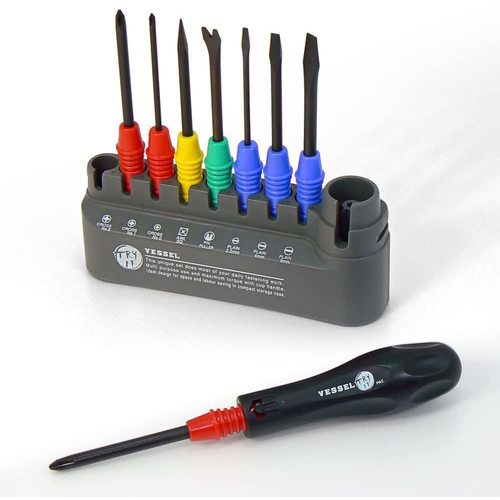 カタログ品番:TD-800 特長:●手のひらにフィットするエルゴノミックハンドルです。●ドライバー軸はクロムバナジウム鋼です。●色分けされたカラフルな差替軸です。●取り出しやすい横一列配列のスタンドです。 仕様:●刃先:[[+]]0、1、2、[[−]]2.5、4、6、角キリ。ピン抜き●軸長(mm):60●全長(mm):180●先端マグネット:入り●セット内容(本):8●セット内容(点):9●ハンドル径(mm):29●セット内容:ハンドル、ドライバー[[+]]0、1、2、[[−]]2.5、4、6、角キリ、ピン抜き●先端:マグネット入り●全身焼入 材質/仕上:●軸:クロムバナジウム鋼 ●グリップ:ポリプロピレン セット内容/付属品:●ハンドル、ドライバー[[+]]0、1、2、[[−]]2.5、4、6、角キリ、ピン抜き