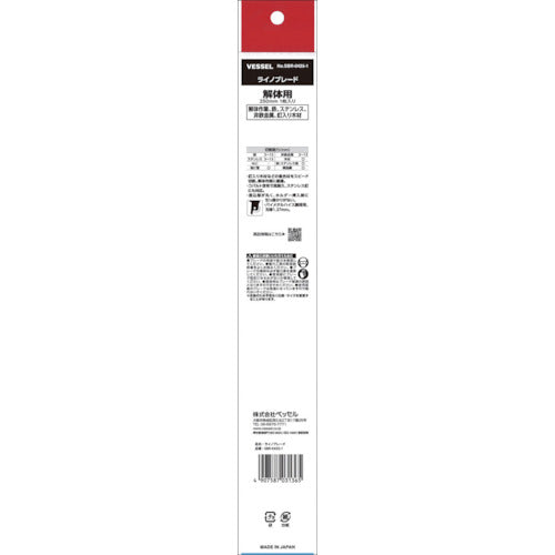 カタログ品番:SBR-0425-1 特長:●解体作業を重視した、厚刃仕様になっています。●釘入り木材などの複合素材に最適です。●コバルトハイス鋼とバネ鋼のバイメタルを使用、刃の耐久性に優れています。●ホルダー装着時に引っ掛かりがない角R形状です。●用途がわかるアイコンを表示しています。●製品情報にアクセスできるQRコードを印字しています。 用途:●各種解体作業、ALCの切断などに。 仕様:●山数:10&14●全長(mm):250●厚さ(mm):1.27●有効刃長(mm):230●切断能力(mm)非鉄金属鋼材:3〜13●切断能力(mm)ステンレス:3〜13●切断能力(mm)ステンレス管・鉄 :3.0〜13.0●切断(木材・塩ビ管):〇●刃先の硬度900HV 材質/仕上:●バイメタルハイス鋼