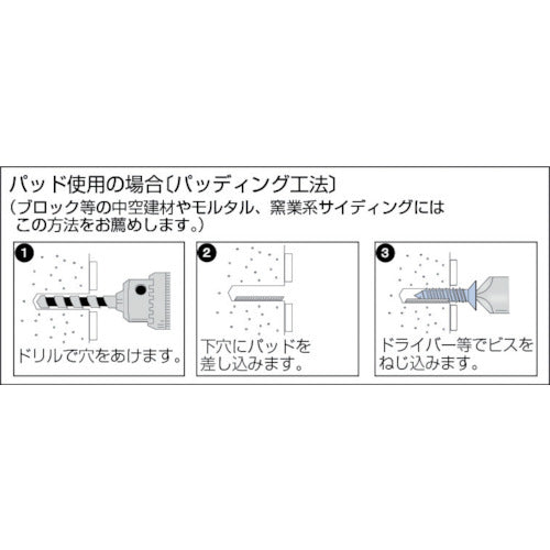カタログ品番:BS425 特長:●プラグなしでコンクリートに使用可能です。●締め過ぎなどでビスが空回りした場合にパッド使用で同じ箇所での再取り付けができます。 用途:●設備工事、大工、配管工事、電気工事。 仕様:●呼び径d(mm):4●下穴径(mm):3.4〜3.5●引張最大荷重(kN):1.50●穿孔深さ(mm):35●長さ(mm):25●適合ドライバー:プラスNo.2 材質/仕上:●スチール
