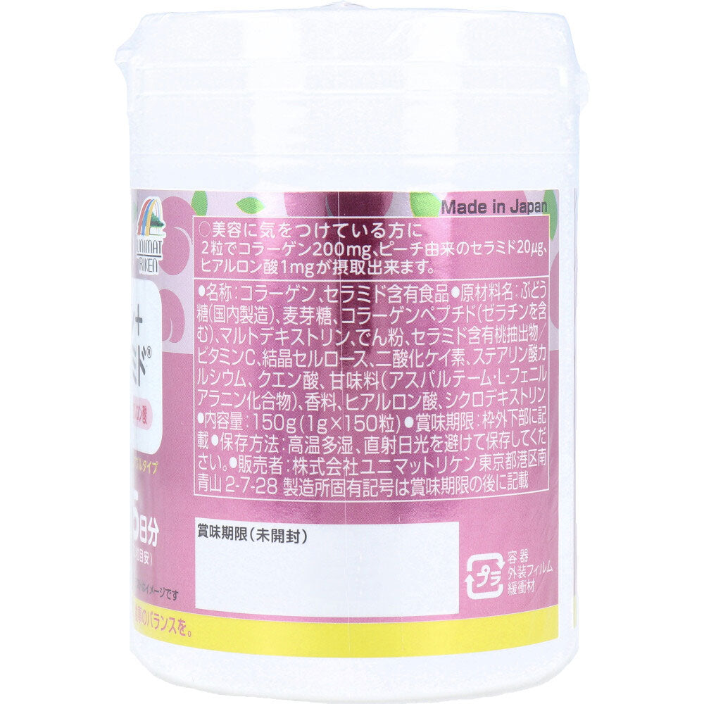 ぶどう糖(国内製造)、麦芽糖、コラーゲンペプチド(ゼラチンを含む)、マルチデキストリン、でん粉、セラミド含有桃抽出物/ビタミンC、結晶セルロース、二酸化ケイ素、ステアリン酸カルシウム、クエン酸、甘味料(アスパムテール、L-フェニルアラニン化合物)香料、ヒアルロン酸、シクロデキストリン