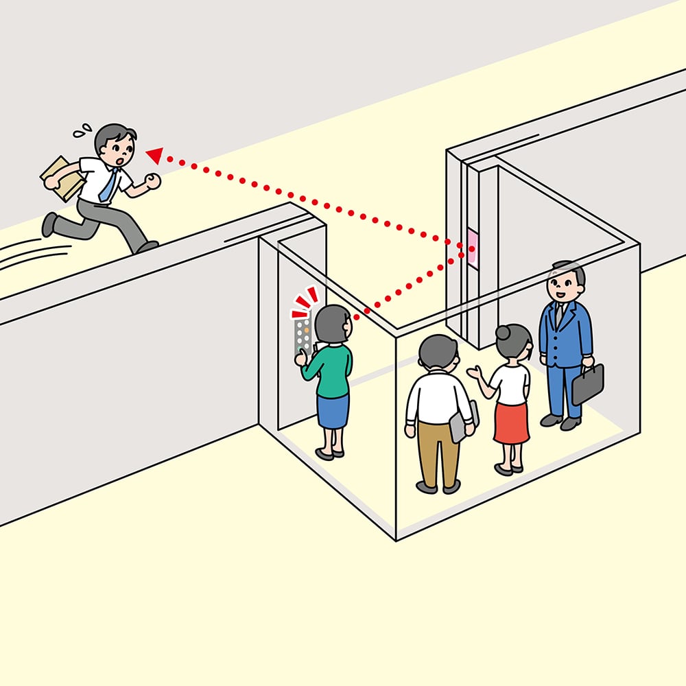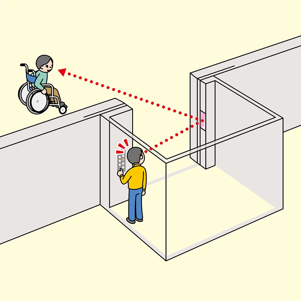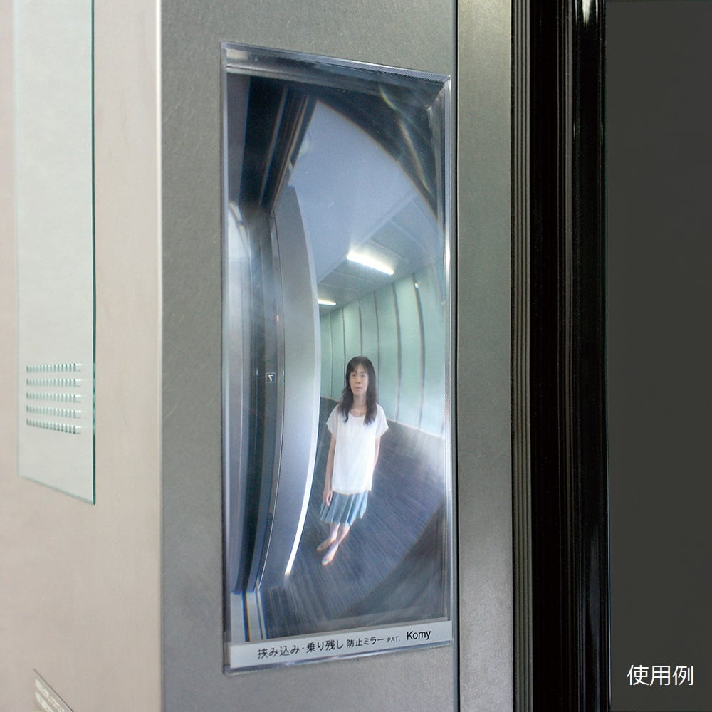 エレベータの乗り残し・挟み込み防止に。 安全な運行と昇降回数の削減に。 利用者同士の気くばりに。 1枚で複数階を対策。 エレベータの出入り口柱(前柱)に貼って使うミラー。 エレベータ内から顔を出さなくても、ミラーを見るだけで乗り込もうとしている人がいないか確認できる。サイズ:W85×H205(mm) ミラーの厚さ:2.1(mm) 重量:42(g) 像の大きさ:180R相当 材質:ポリカーボネート 取付方法:強力両面テープ(裏面に貼付済み) 取付場所:エレベータかご内 出入口柱(前柱) 室内専用(直射日光・水濡れ不可) 【注意事項】 FFミラーの性質として、ライト等の光が当たった場合、角度によっては見えにくくなることがあります。