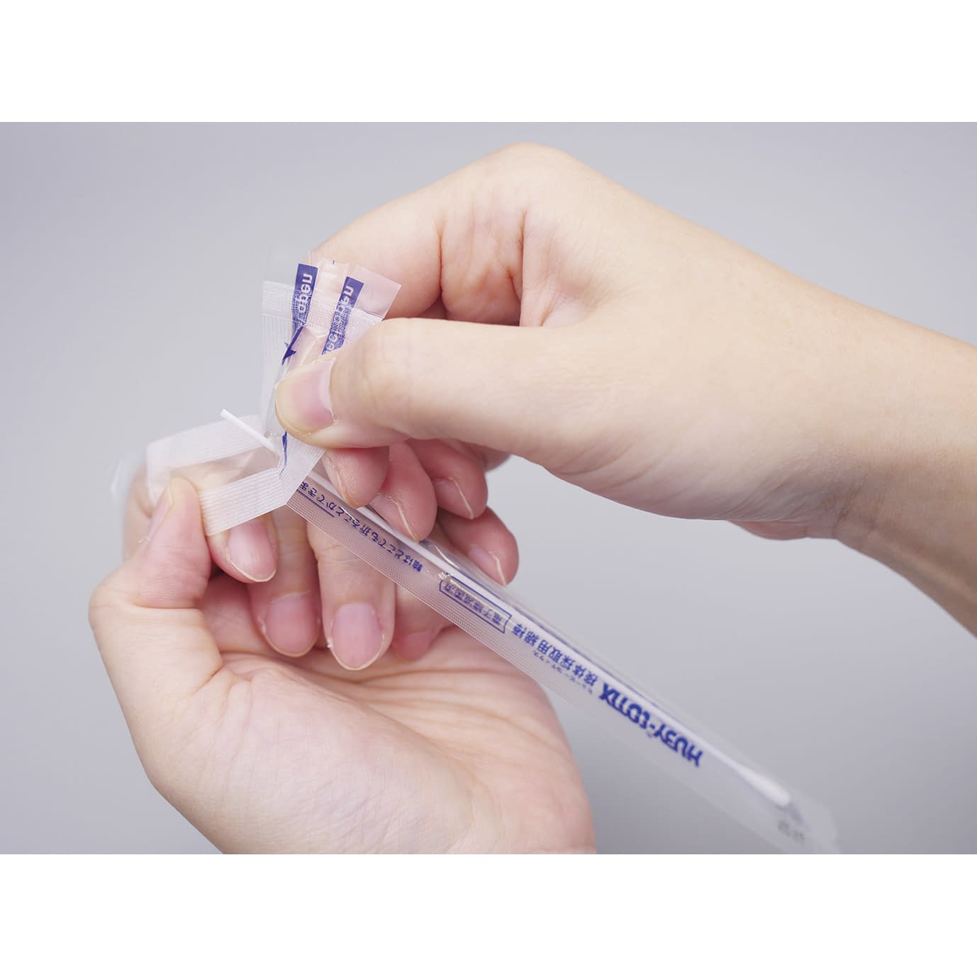 メーカー品番:24-9768-00 商品説明 ●PCR検査時の鼻咽頭、鼻腔からの検体採取用です。 ●輸送容器サイズを選ばない、どこからでも折れる軸を採用しています。 ●電子線滅菌済。 商品スペック ●カラー:ホワイト ●製品サイズ:綿径φ3.5×全長148mm ●本体重量:0.7 g ●材質:ポリエステル、ポリスチレン ●個装入数:100本 薬事分類:一般医療機器 販売名:HUBY-COTIX 検体採取用綿棒