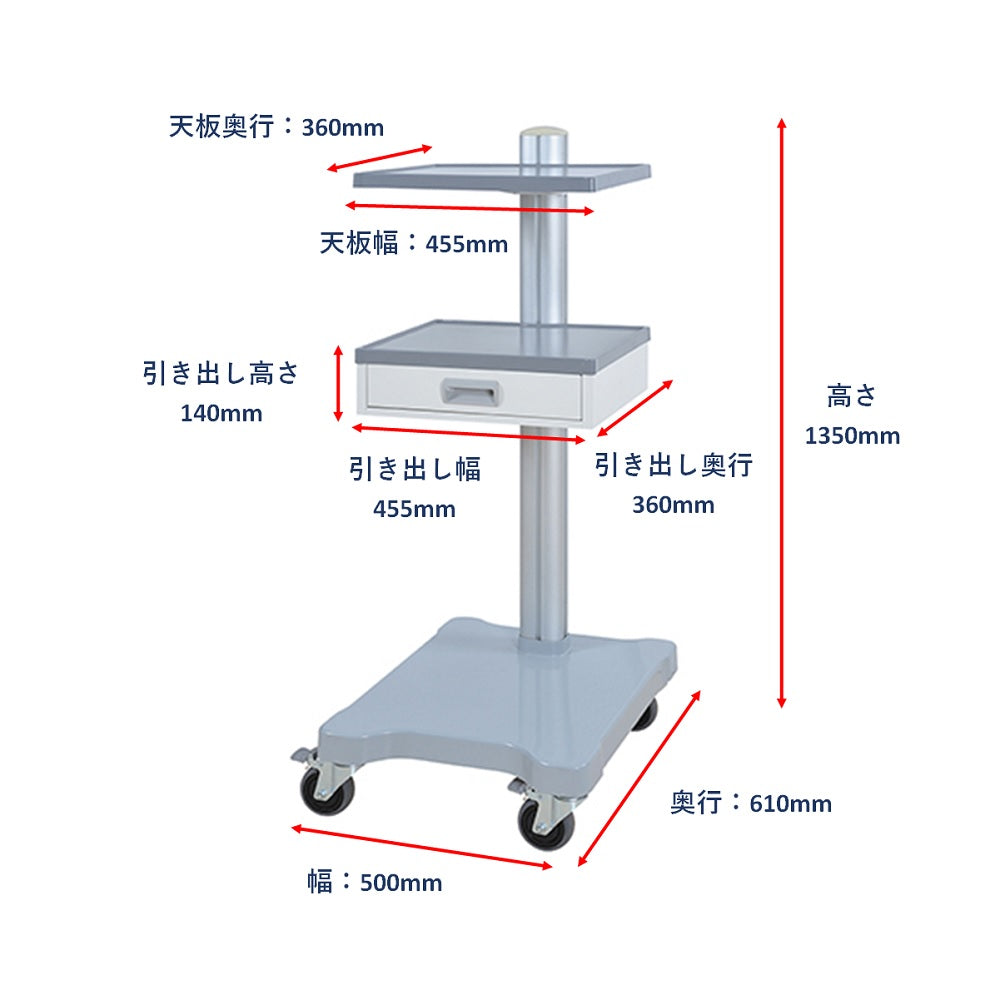 使用方法に応じてオプション部品が選べます。 天板の高さは任意に調節可能です。 天板カバー・ベースカバーは取り外して洗浄可能です。仕様:引き出し・天板付き 幅×奥行×高さ(mm):500×610×1350 材質:支柱/アルミ、ベース・天板/スチール、天板カバー・ベースカバー/ABS樹脂 天板サイズ:455×360×30mm 天板耐荷重:10kg 天板高さ:180~1350mm 引き出しサイズ:455×360×140mm 重量:35kg キャスター:Φ100mmエラストマー製(前輪ストッパー付き) 組み立て式