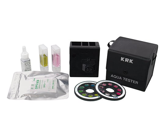 構成:比色測定器、DPD比色盤×1枚、pH比色盤×1枚、角型比色管(フタ付)×2本、DPD測定試薬(遊離残留塩素)×50回分、BTB指示薬18mL、携帯ケース