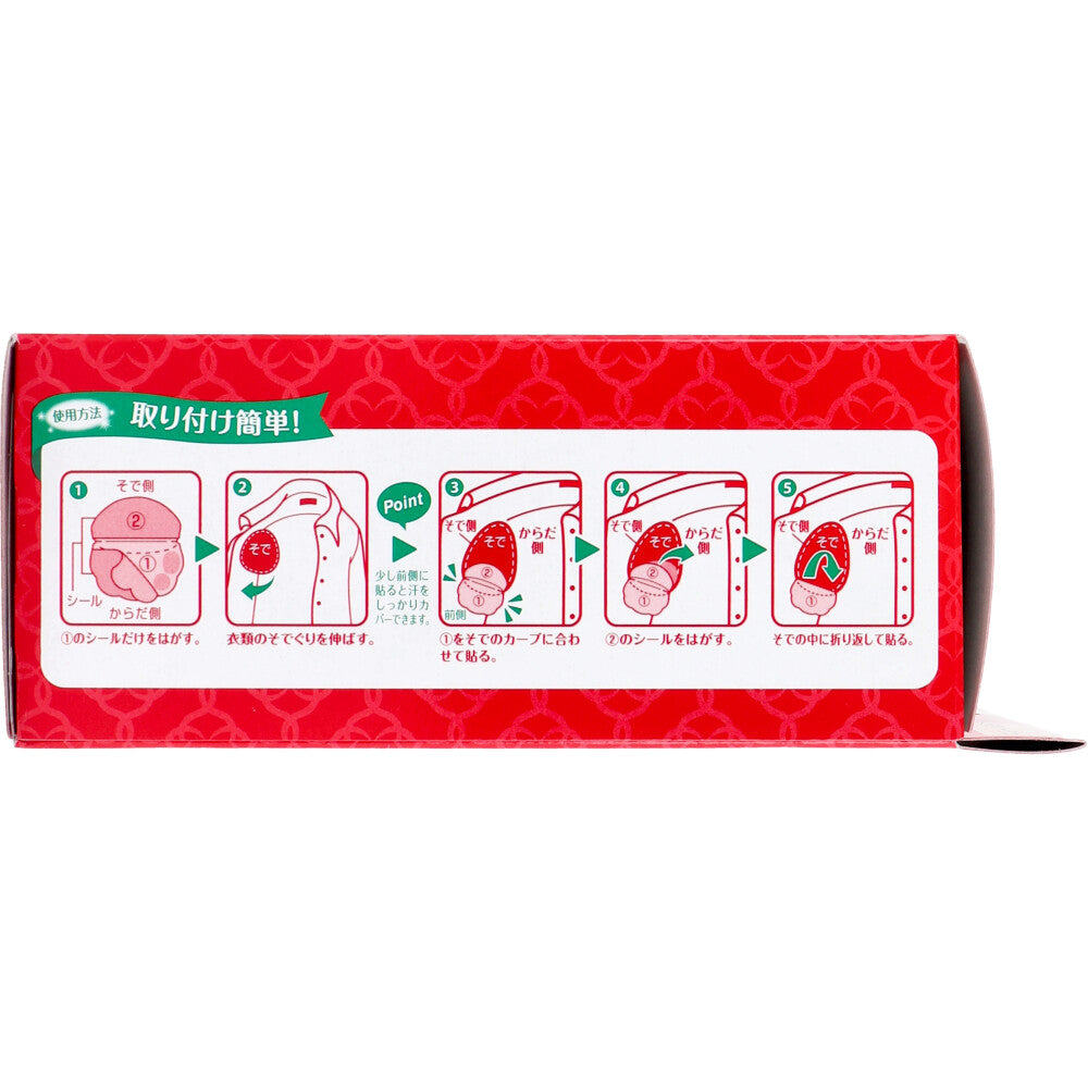 衣類に貼るだけ、しっかり吸収 汗ジミ防止! 衣類に貼って、汗ジミ・黄ばみを防ぐ。 貼りやすく、動きにフィットするスリット加工を採用。 衣類に貼りやすくなり、ヨレ・ズレしにくい! ●表面の汗を残しにくい、メッシュ素材の吸引シートを採用。汗をすばやく引き込んで、表面のさらさら感が続く。 ●イオン抗菌で汗のニオイを防ぐ。 ●3層構造で、汗をしっかり吸収。(1)汗をすばやく引き込む吸引シート (2)汗をたっぷり吸いとる吸水シート (3)汗をもらさないストッパーシート ●ごわごわしない約1mmの薄型シート。 ●はがれにくいドット形状のり。 【材質】 表面主材:ポリプロピレン 【サイズ】 (約)11×12cm 【使用方法】 取り付け簡単! 1.片方のシールだけをはがす。 2.衣類のそでぐりを伸ばす。 3.(1)をそでのカーブに合わせて貼る。 Point:少し前側に貼ると汗をしっかりカバーできます。 4.残りのシールをはがす。 5.そでの中に折り返して貼る。 【注意】 ・麻や綿、混紡の素材・伸縮性のある衣類・機能性衣類・柔軟剤を使用した衣類には、接着しにくい場合がある。 ・衛生上および機能上、一度使用したシートは繰り返し使用しない。 ・使用中や使用後に肌に異常があらわれた場合は、使用を中止する。 ・万が一、使用後に衣類の表面に糊が残った場合は、そのまま洗濯したり、アイロンや乾燥機など、熱を加えない。 ★衣類への糊残りや衣類変色を防ぐため、次のことに注意して使用する。 ・シートは着用した当日中にとりはずす ・とりはずす際はゆっくりと丁寧にはがす ・シートを装着したまま洗濯しない ・シートを装着する直前や装着したまま、アイロンや乾燥機など、熱を加えない